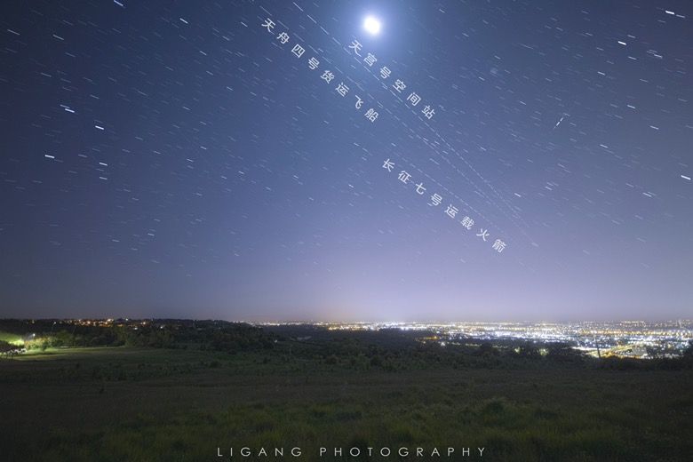 5月16日,中国空间站过境南京,天舟四号与核心舱、天舟三号组成“一”字构型。(徐成城、朱一静 提供)
