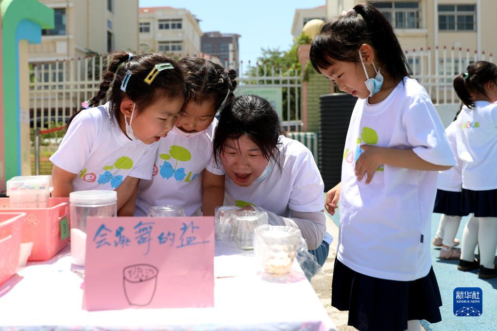 5月27日,在山东青岛西海岸新区滨海新村幼儿园举办的“乐享科技节”主题活动上,孩子们在老师指导下体验趣味游戏。