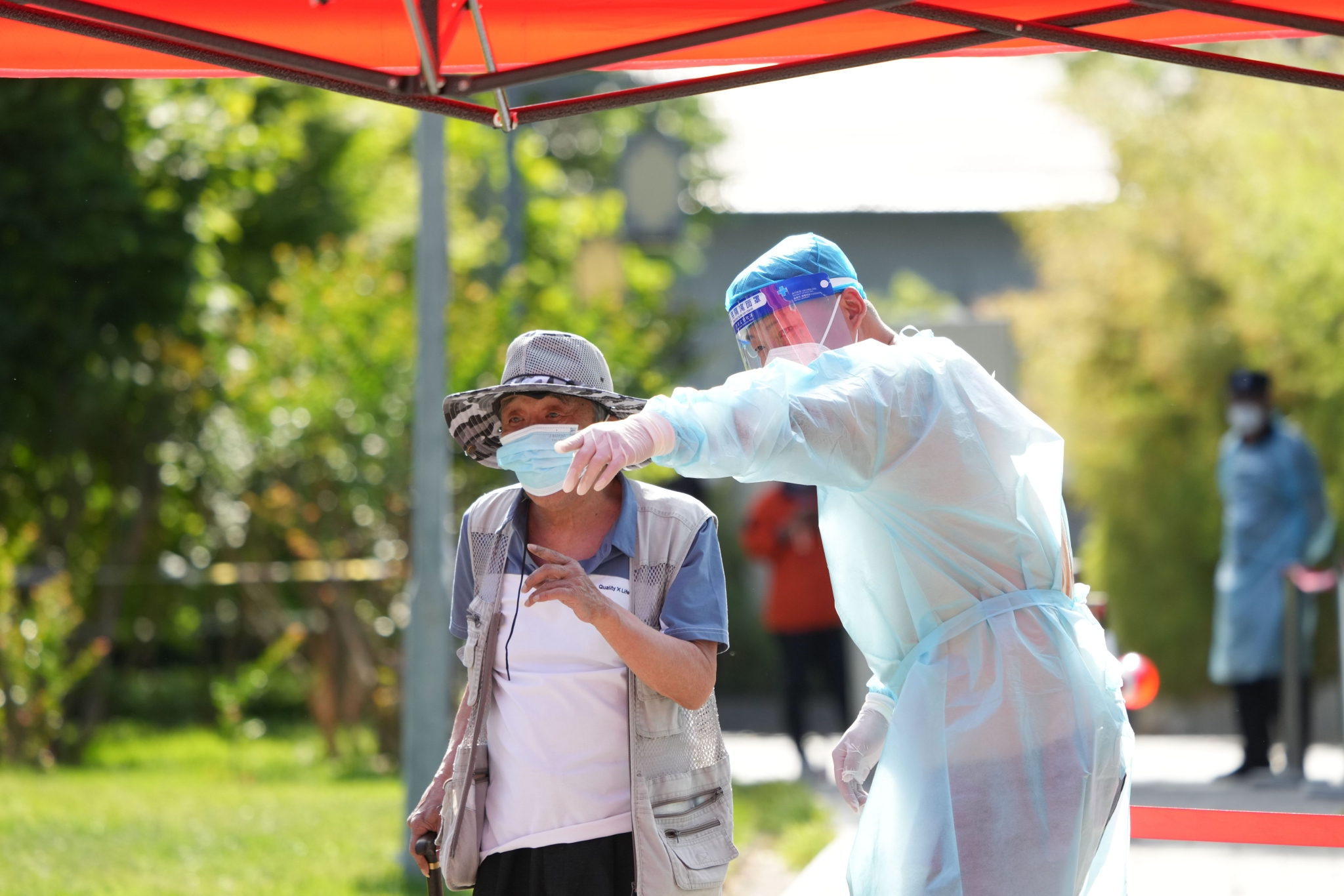 5月26日,在北京市东城区建国门街道一处核酸采样点,志愿者(右)引导居民参加核酸检测。新华社记者 鞠焕宗 摄