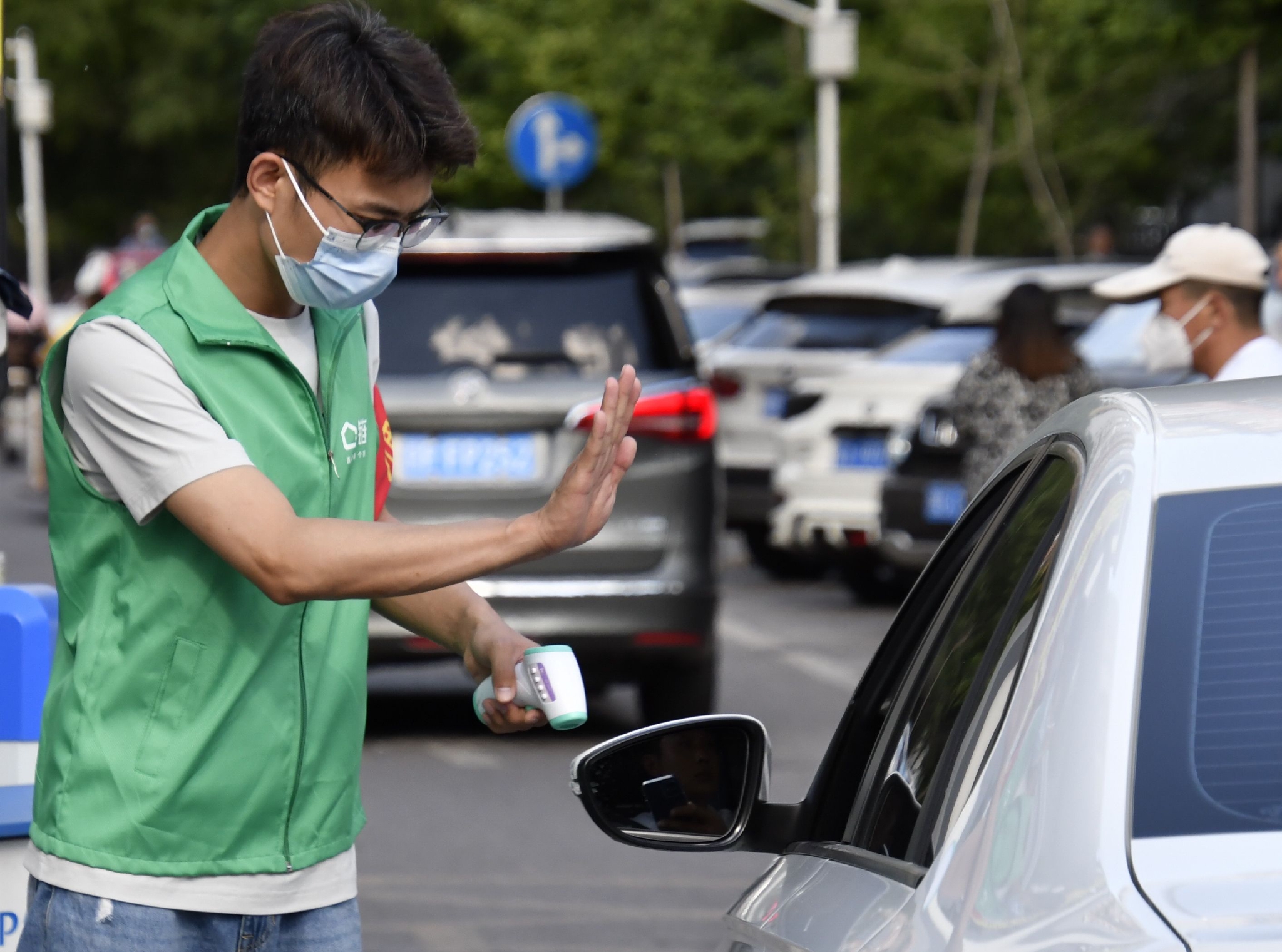 共青团员、青年志愿者姜宽在北京朝阳区八里庄街道十里堡社区的入口进行测温和健康码查验(5月26日摄)。新华社记者 李欣 摄