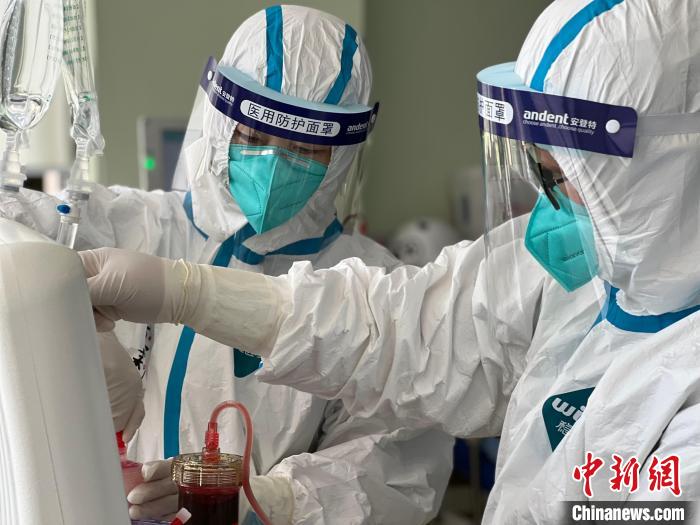 “身着‘大白’戴手套等标准防护后,透析患者穿刺难度加大,治疗期间医护人员需不断进行床边巡视、监测血流量及动静脉压的变化等,下机后消杀较正常程序增加、时间延长,工作强度较正常成倍增加。”山西援沪医疗队3队护理负责人张洁介绍。