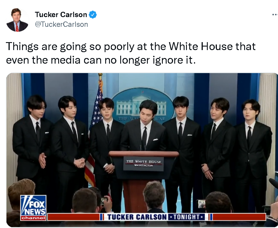 在这段视频中,卡尔森这名美国保守派政治势力的头牌“名嘴”,原本是想抨击拜登的支持率下降以及白宫内部管理一团糟的情况。可在讽刺拜登时,他却把拜登接见韩国偶像团体“防弹少年团”的事情也拿出来进行了一番挖苦,称拜登根本不会解决实际的问题,只知道找这种韩国偶像团体来做一些虚伪的“公关”。他还称拜登的一些政策也在助长针对亚裔的种族歧视。