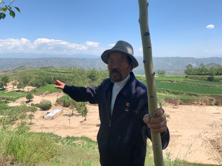 60多年来,他的脚步几乎踏遍全乡,乡里有几道山梁,有几条沟壑,甚至在哪里种了哪些树他都清楚。他在十二条沟沟岔岔都栽满了杨树和松树,周边的十几面坡上栽满了柠条,截至目前累计种下的树超过8万株。