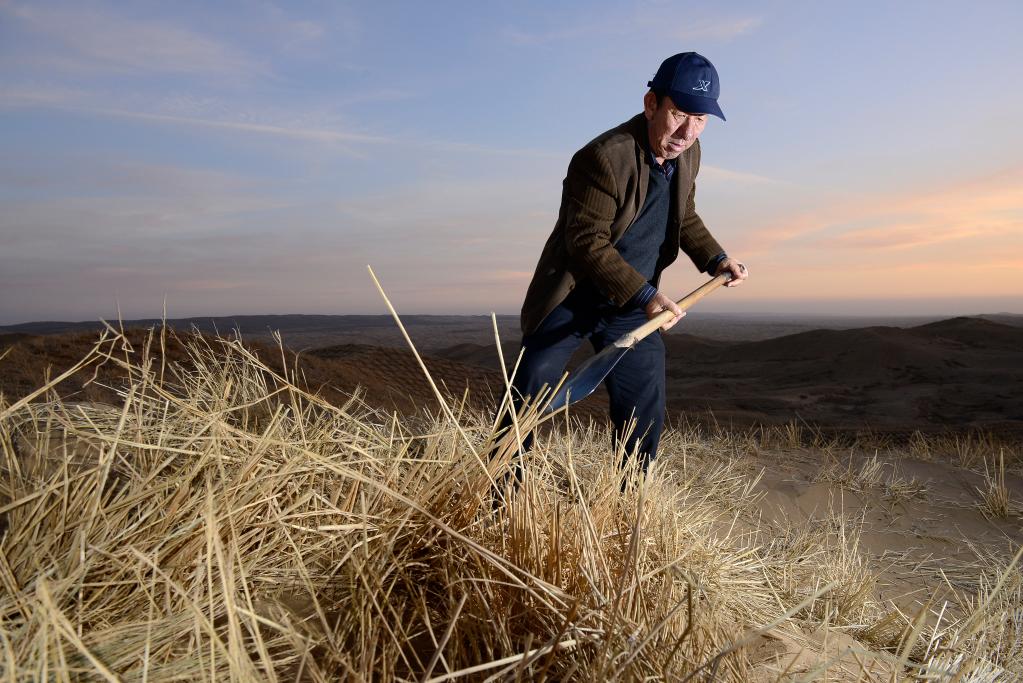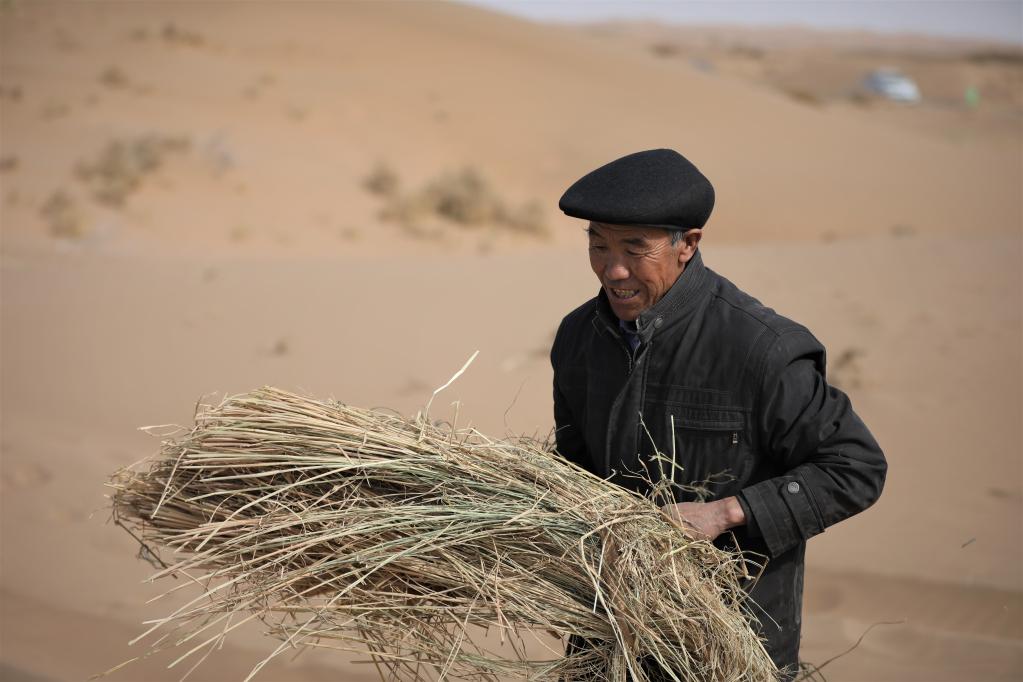 2020年3月5日,在古浪县北部沙区旱麻岗治沙点,郭万刚在扎草方格压沙。新华社发(马希平摄)