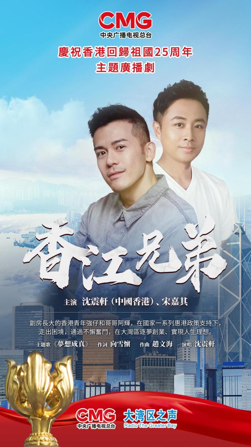 此外,由香港演员沈震轩和内地演员宋嘉其主演的主题广播剧《香江兄弟》(粤语/普通话两版),也将于6月下旬在总台大湾区之声、香港电台等广播平台播出,新媒体平台同步上线。
