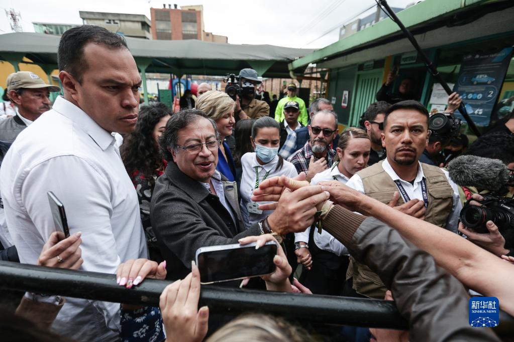 6月19日,左翼竞选联盟“哥伦比亚历史公约联盟”候选人古斯塔沃·佩特罗(前左二)在哥伦比亚首都波哥大一处投票站与支持者握手。