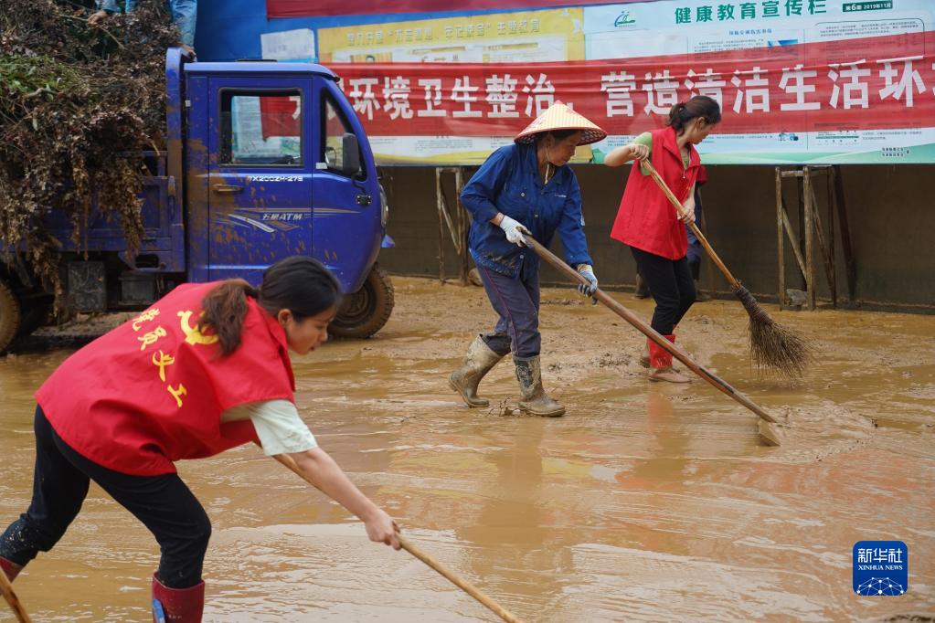 6月21日,在江西省德兴市泗洲镇张家畈社区,党员干部在清理淤泥和垃圾。6月17日以来,江西多地遭遇强降雨袭击。洪水退去后,江西省德兴市的干部和群众一起对受灾严重的乡镇展开道路清淤、设施抢修等工作。新华社记者 周密 摄