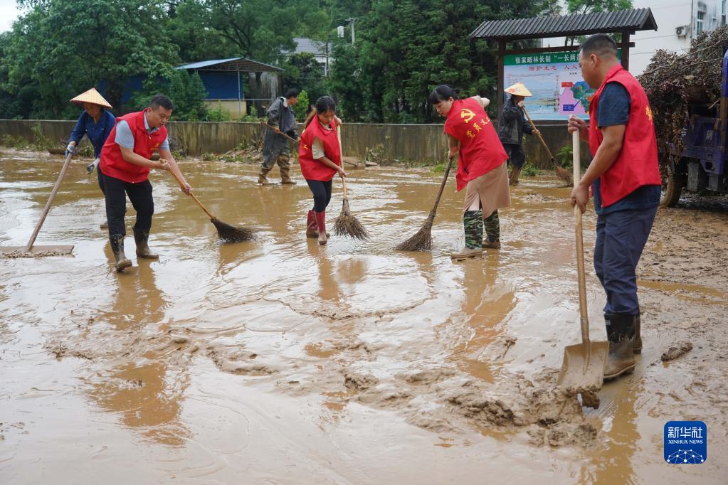6月21日,在江西省德兴市泗洲镇张家畈社区,党员干部在清理淤泥和垃圾。6月17日以来,江西多地遭遇强降雨袭击。洪水退去后,江西省德兴市的干部和群众一起对受灾严重的乡镇展开道路清淤、设施抢修等工作。新华社记者 周密 摄