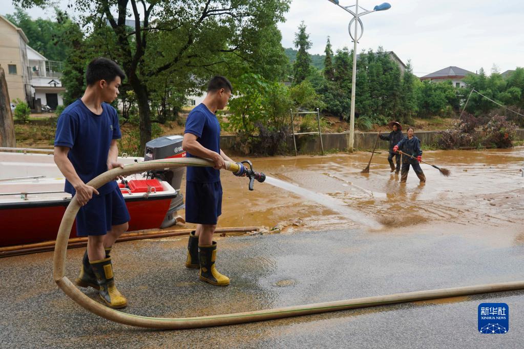 6月21日,在江西省德兴市泗洲镇张家畈社区,消防人员在清理路面上的淤泥。6月17日以来,江西多地遭遇强降雨袭击。洪水退去后,江西省德兴市的干部和群众一起对受灾严重的乡镇展开道路清淤、设施抢修等工作。新华社记者 周密 摄