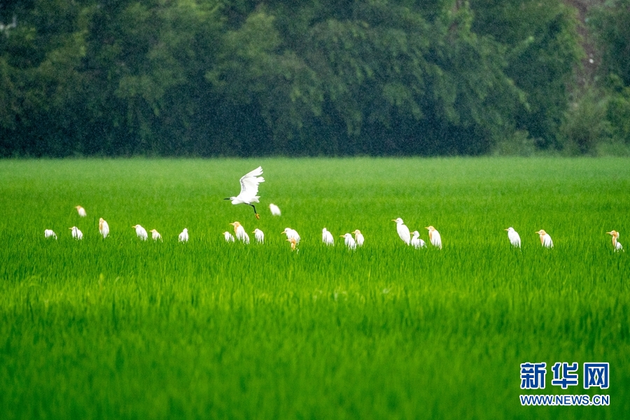 大理洱源,稻田鹭鸟,一派田园风光(摄于6月28日)。新华网发(罗新才/摄)