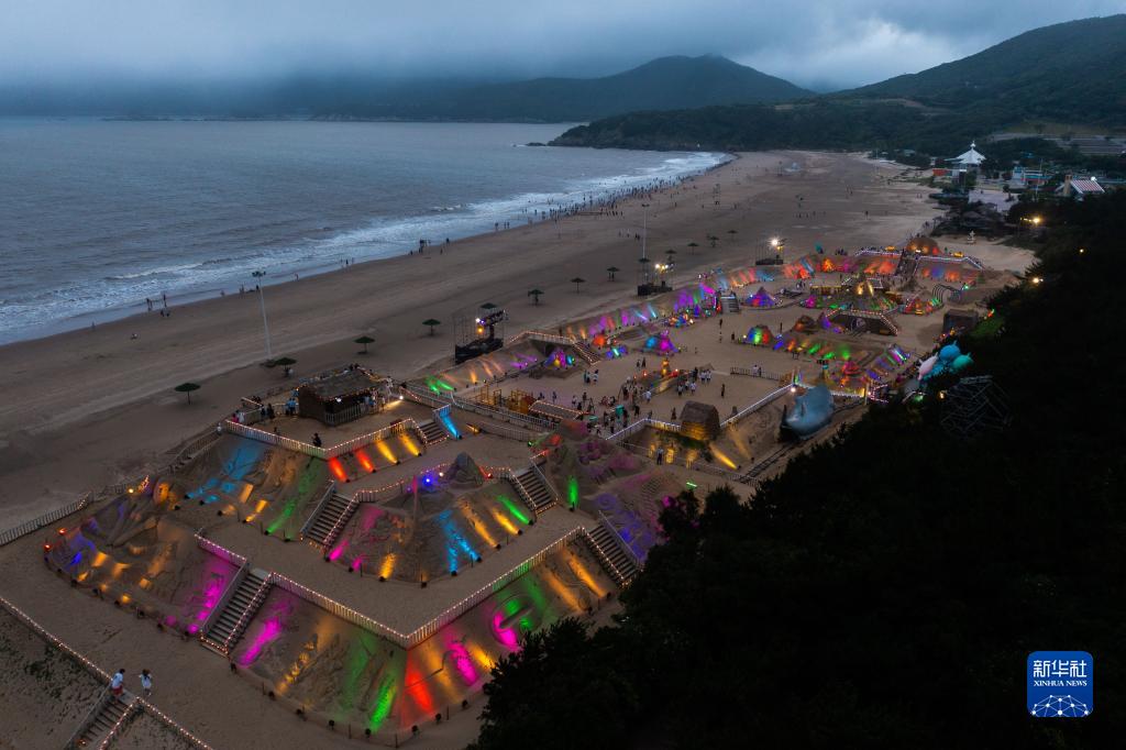 6月28日,夜色中的沙雕展示区被灯光点亮(无人机照片)。新华社记者 徐昱 摄
