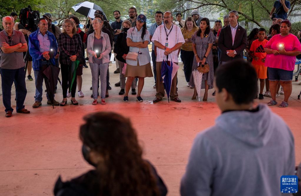 6月28日,人们在美国得克萨斯州圣安东尼奥市悼念货车惨案死亡移民。美国执法人员27日在得克萨斯州圣安东尼奥市一辆大货车车厢里发现大量移民尸体。这起货车惨案造成至少51人死亡,是美国近年来最严重的移民死亡事件之一。新华社发(尼克·瓦格纳摄)