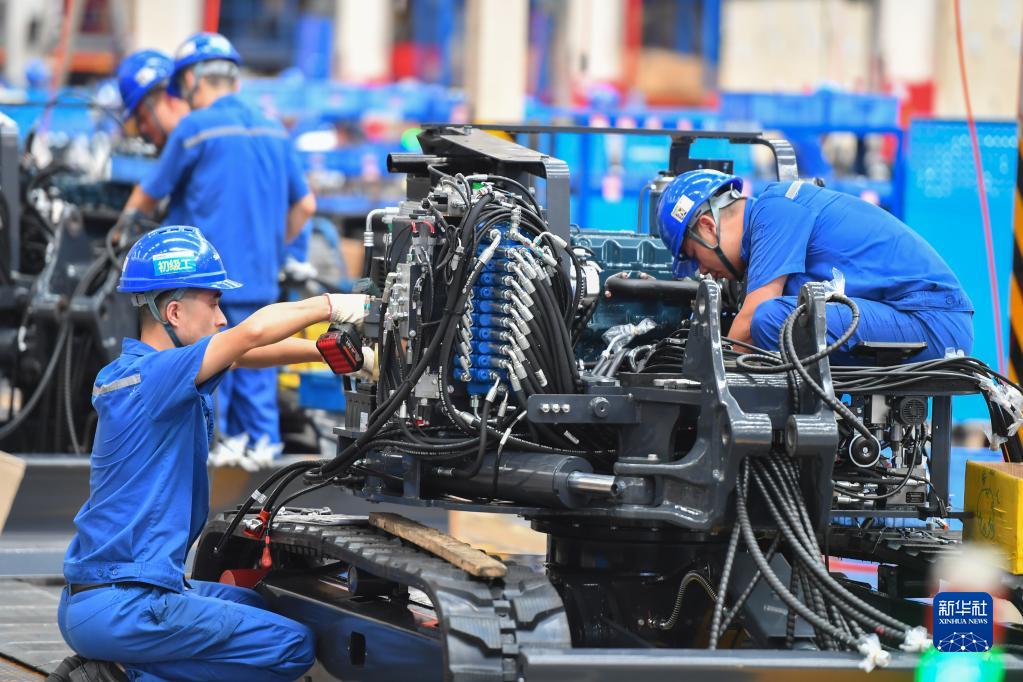 在位于长沙经开区的一家智能装备公司,工作人员在组装机械装备(2022年7月1日摄)。新华社记者 陈泽国 摄