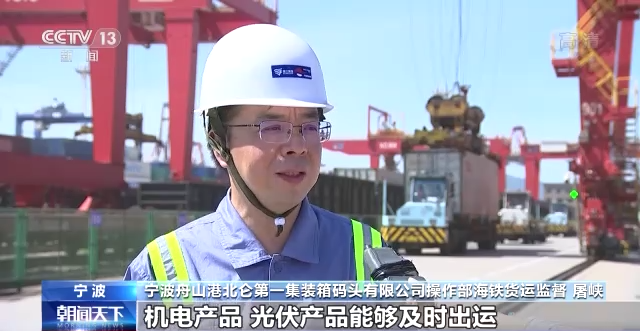 宁波舟山港北仑第一集装箱码头有限公司操作部海铁货运监督 屠峡:现在海铁联运的班列一共有21条,确保了义乌、金华等地的机电产品、光伏产品能够及时出运。到上半年为止,我们海铁联运(量)同比增长32.4%。