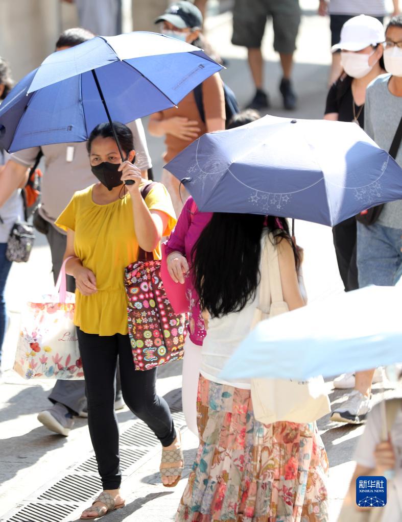 7月24日,在香港街头,市民撑伞出行。近日,香港迎来高温酷热天气。香港天文台预计,7月余下几天香港仍将持续酷热。新华社记者 李钢 摄
