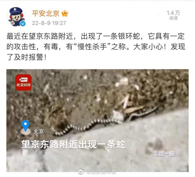 北京市公安局8月9日通报称,最近在望京东路附近,出现了一条银环蛇,它具有一定的攻击性,有毒,有“慢性杀手”之称。警方提醒,市民发现了该蛇请及时报警。