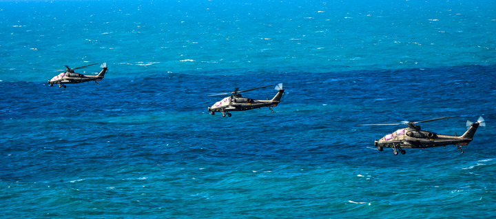 陆军第73集团军某陆航旅组织战机编队海上低空飞行训练(2021年11月13日摄)。 新华社发(李士龙 摄)