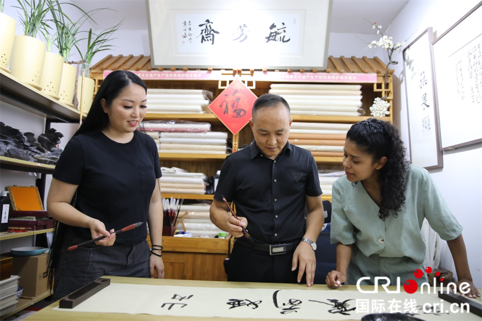 危地马拉视频博主塞莉娅(右)、巴西视频博主塞米(左)向书法家向永龙请教书法技法 摄影 黄正恒