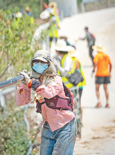 志愿者在铺设输水管道。新华社记者 朱高祥摄