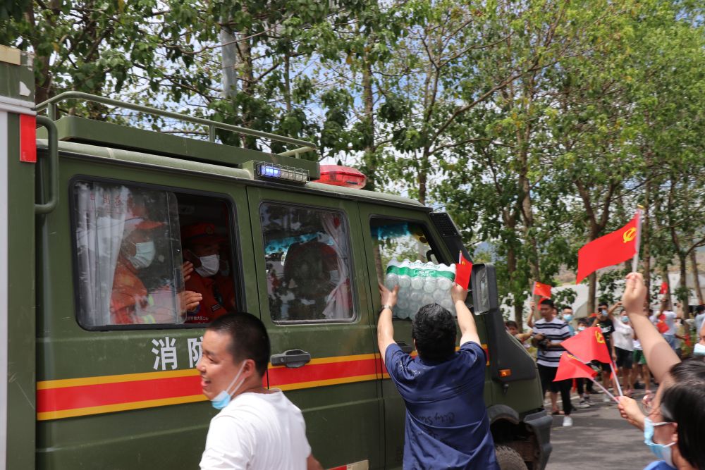 送行群众将矿泉水投送给消防员。新华社记者 周思宇 摄