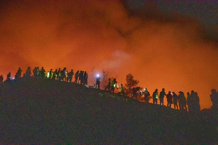 当晚,一张经典的照片在各大社交平台上流传着——山火现场,左边是熊熊的烈火,右边是站在隔离带旁,成千上万救援人员串起的一条“白色灯链”。