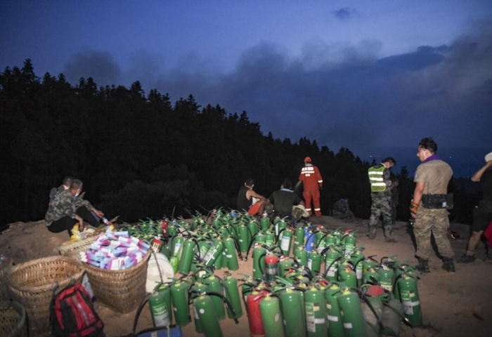 34岁的志愿者余勇当天因为工作原因,凌晨才赶过来。深夜,他爬到那段无法通车的陡坡,和几百个志愿者一起,接力向上运输着灭火器。
