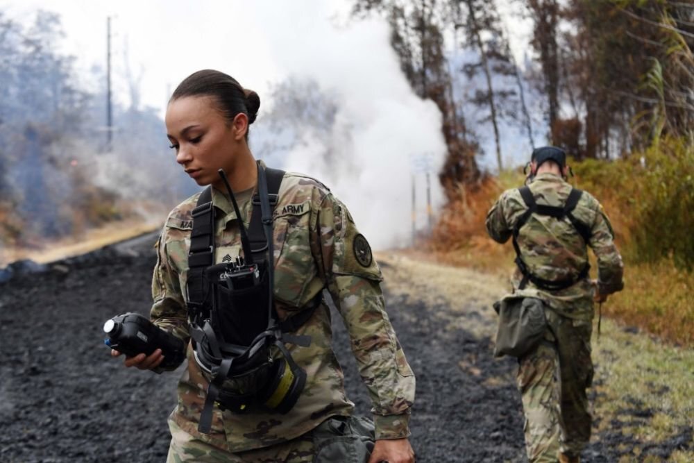 2018年5月9日,在美国夏威夷帕霍阿镇附近的“莉拉妮地产”居民区,两名美军中士在第13号裂缝处监测二氧化硫浓度。新华社记者陶希夷摄