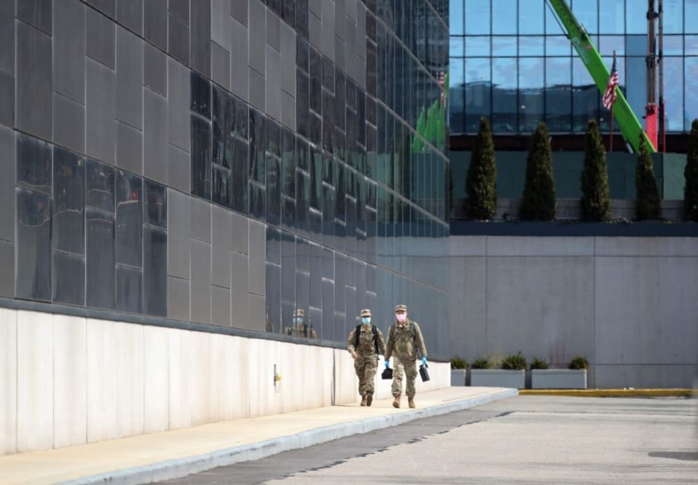 2020年3月24日,在美国纽约曼哈顿,两名军人走出贾维茨会议中心。新华社记者 王迎 摄
