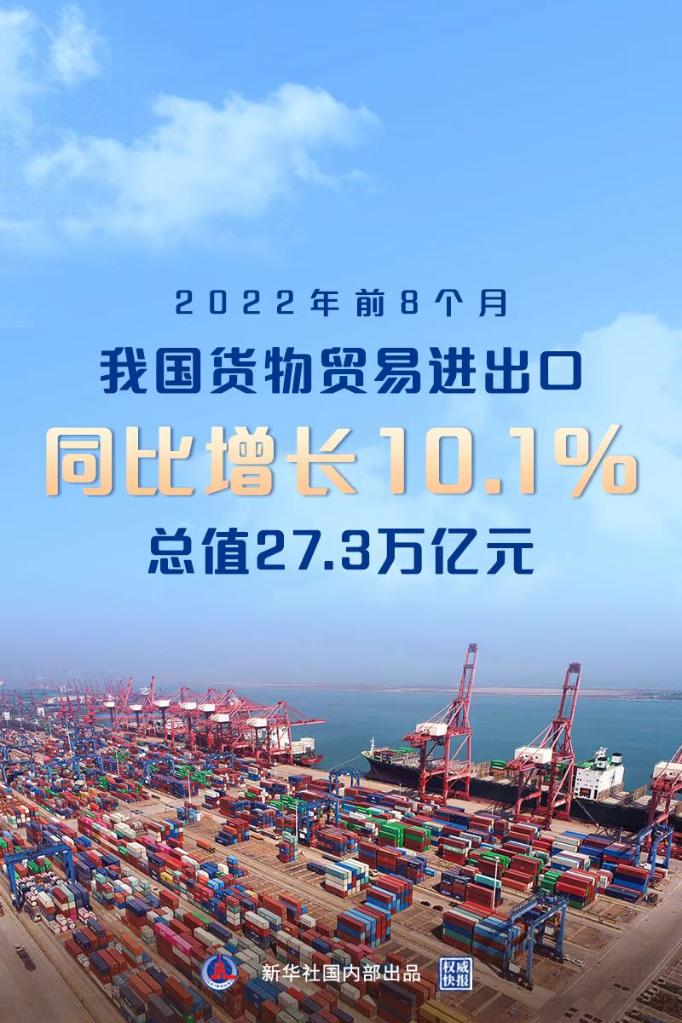 新华社北京9月7日电 海关总署7日发布数据,今年前8个月,我国货物贸易进出口总值27.3万亿元,同比增长10.1%。
