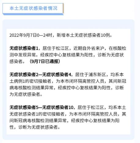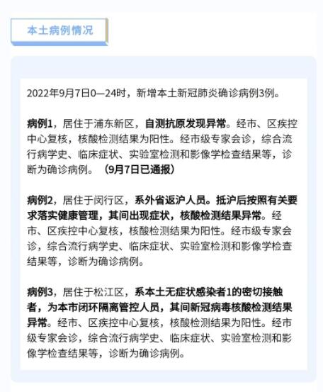 中国网9月8日讯 上海市卫健委8日通报:2022年9月7日0—24时,新增本土新冠肺炎确诊病例3例和无症状感染者10例,其中2例确诊病例和9例无症状感染者在隔离管控中发现。新增境外输入性新冠肺炎确诊病例7例和无症状感染者3例,均在闭环管控中发现。