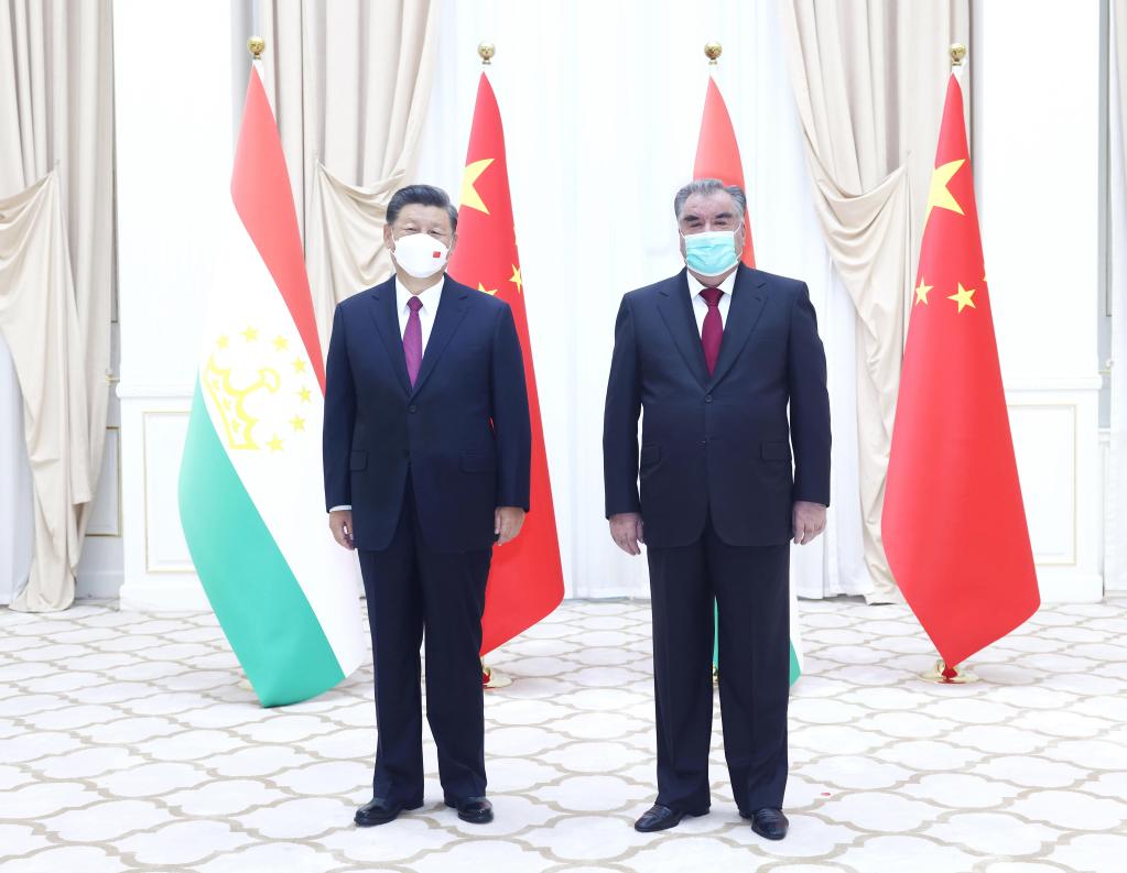 当地时间9月15日上午,国家主席习近平在撒马尔罕国宾馆会见塔吉克斯坦总统拉赫蒙。新华社记者鞠鹏 摄