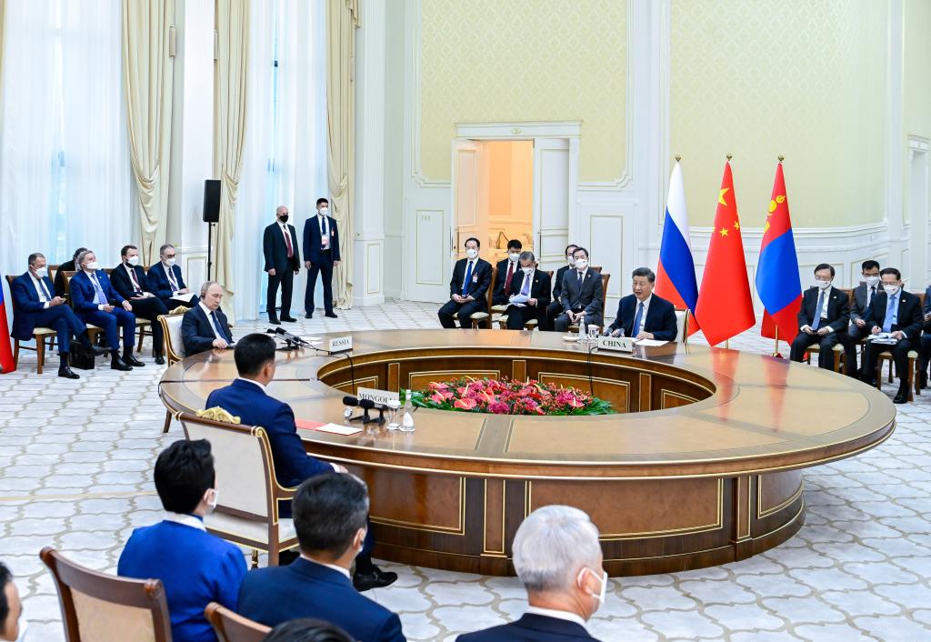 当地时间9月15日下午,国家主席习近平在撒马尔罕国宾馆同俄罗斯总统普京、蒙古国总统呼日勒苏赫举行中俄蒙三国元首第六次会晤。新华社记者翟健岚 摄