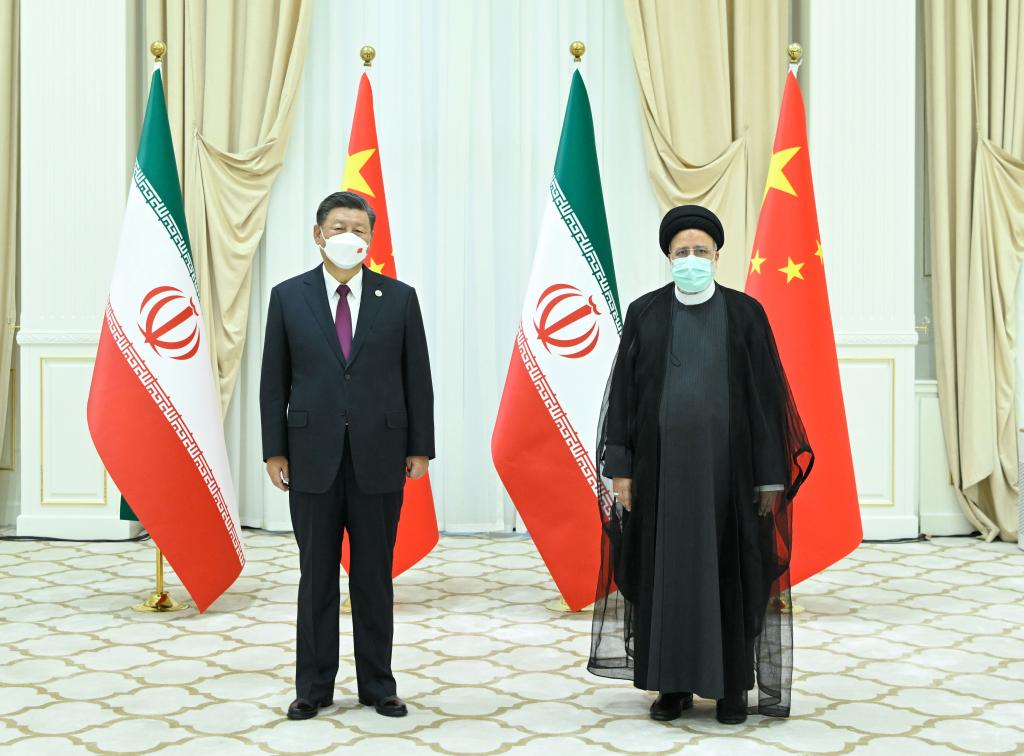 当地时间9月16日上午,国家主席习近平在撒马尔罕国宾馆会见伊朗总统莱希。新华社记者申宏 摄