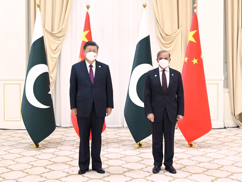 当地时间9月16日上午,国家主席习近平在撒马尔罕国宾馆会见巴基斯坦总理夏巴兹。新华社记者申宏 摄