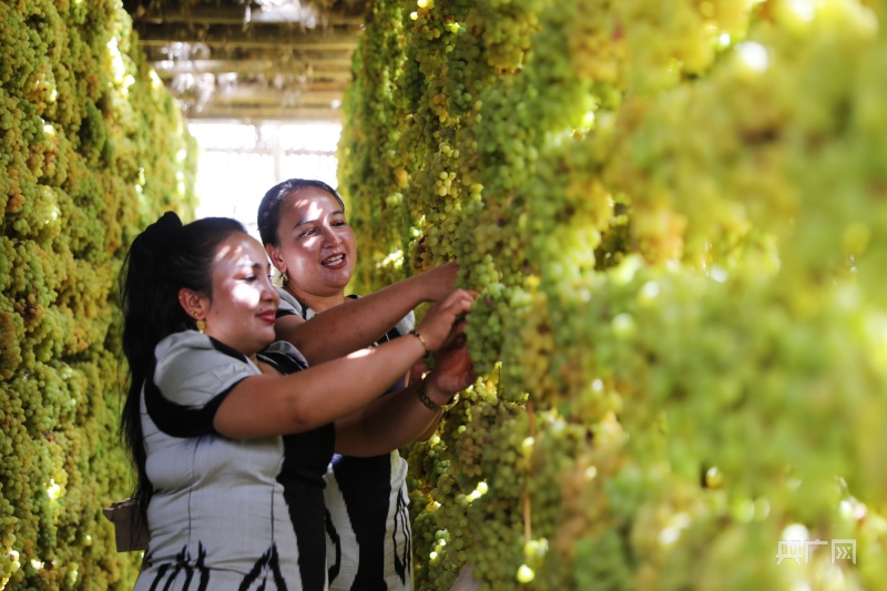 新鲜葡萄在葡萄晾房里自然晾晒(央广网发 乃比江 摄)