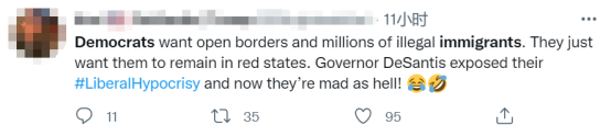 民主党人希望开放边境(给)数以百万计的非法移民。他们只想让这些移民留在“红州”(即共和党多数州)。(佛罗里达)州长德桑蒂斯揭露了他们的#自由主义伪善,现在他们气疯了!(笑哭)
