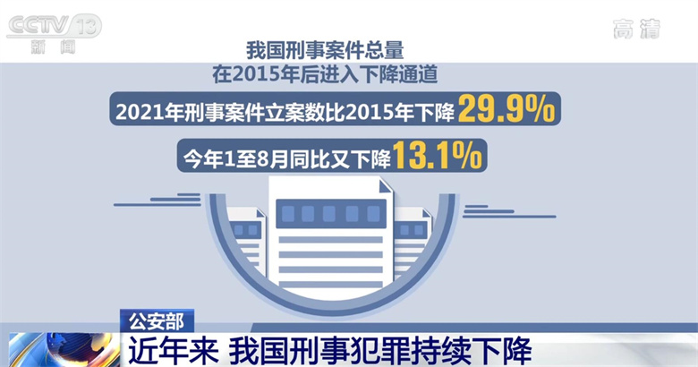 据公安部相关负责人介绍,我国刑事案件总量在2015年后进入下降通道。2021年刑事案件立案数比2015年下降29.9%,今年1—8月同比又下降13.1%。