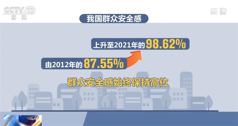 据统计,我国群众安全感由2012年的87.55%上升至2021年的98.62%,群众安全感始终保持高位。