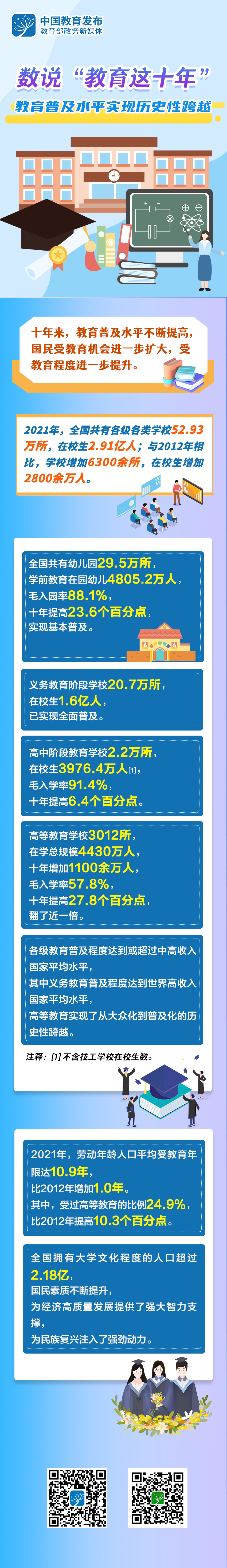 教育是国之大计、党之大计。党的十八大以来,我国教育面貌正在发生格局性变化。即日起,教育部政务新媒体推出“教育新征‘图’”专栏,“图”说教育这十年,迎接党的二十大胜利召开。今天,跟教育小微通过一组数据了解“教育普及水平实现历史性跨越”——