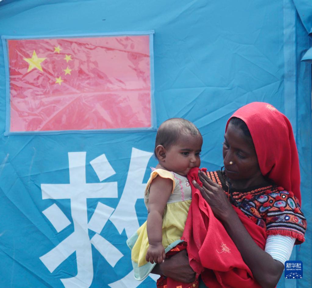 9月29日,在巴基斯坦南部信德省伯丁地区马德利镇临时营地,灾民抱着孩子站在中国援助的帐篷前。