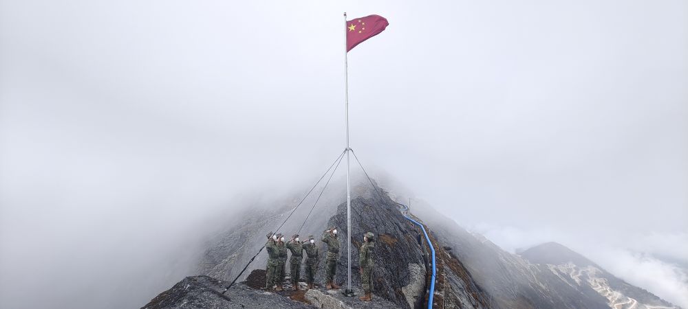 △10月1日,西藏亚东海拔4655米的詹娘舍哨所官兵在哨所旁的崖壁上举行升国旗仪式。