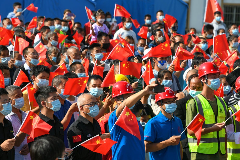 △ 10月1日,在四川省甘孜州泸定县得妥镇天池山村繁荣集中过渡安置点,人们在升国旗仪式后挥舞国旗。