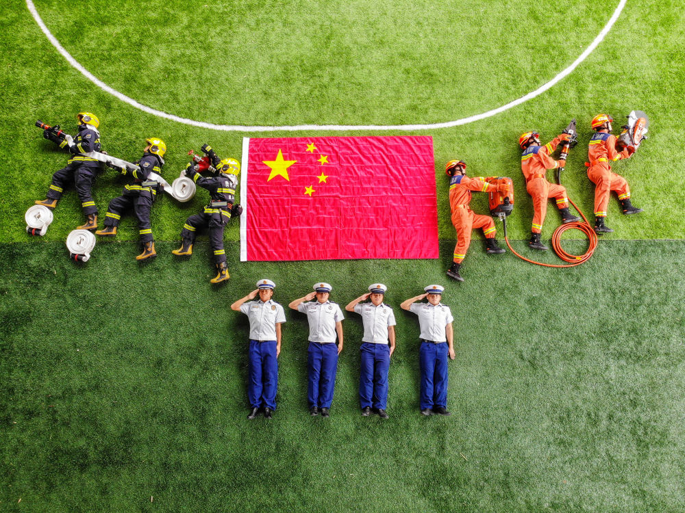 △10月1日,贵州省遵义市的消防队员在“我和国旗合个影”主题活动中拍照。