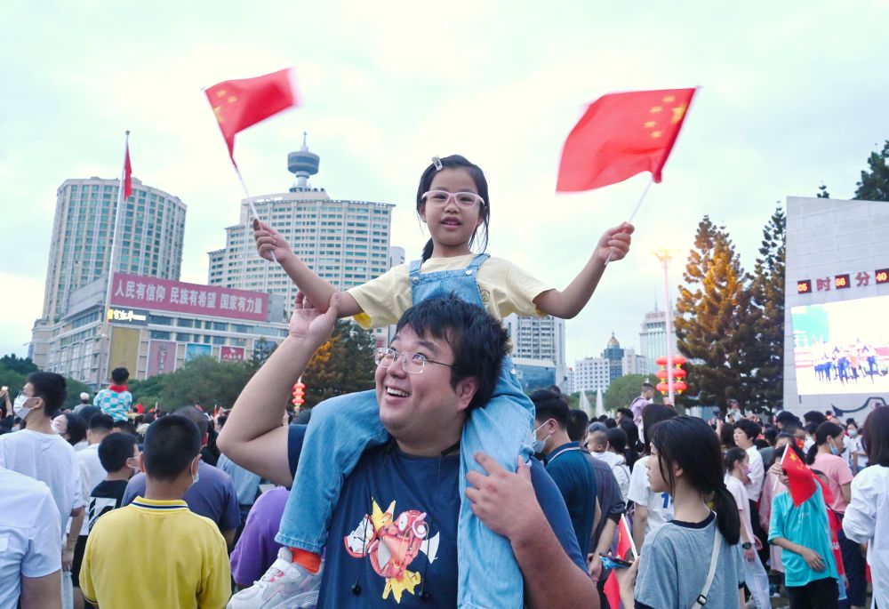 △ 10月1日,人们在福州市五一广场参加升国旗仪式。