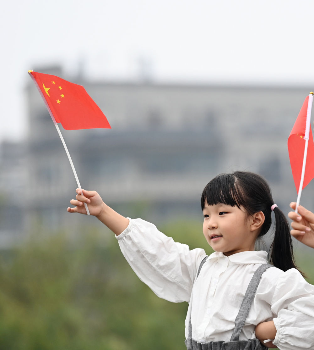△10月1日,小游客在西安城墙景区挥舞国旗。
