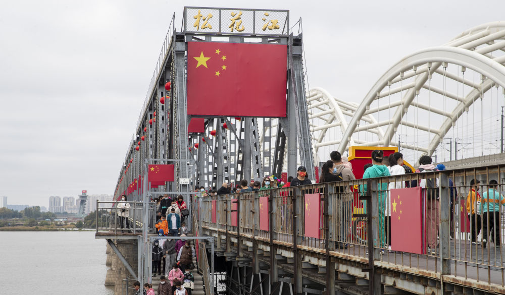 △10月1日,市民在哈尔滨市滨州铁路桥上游览。