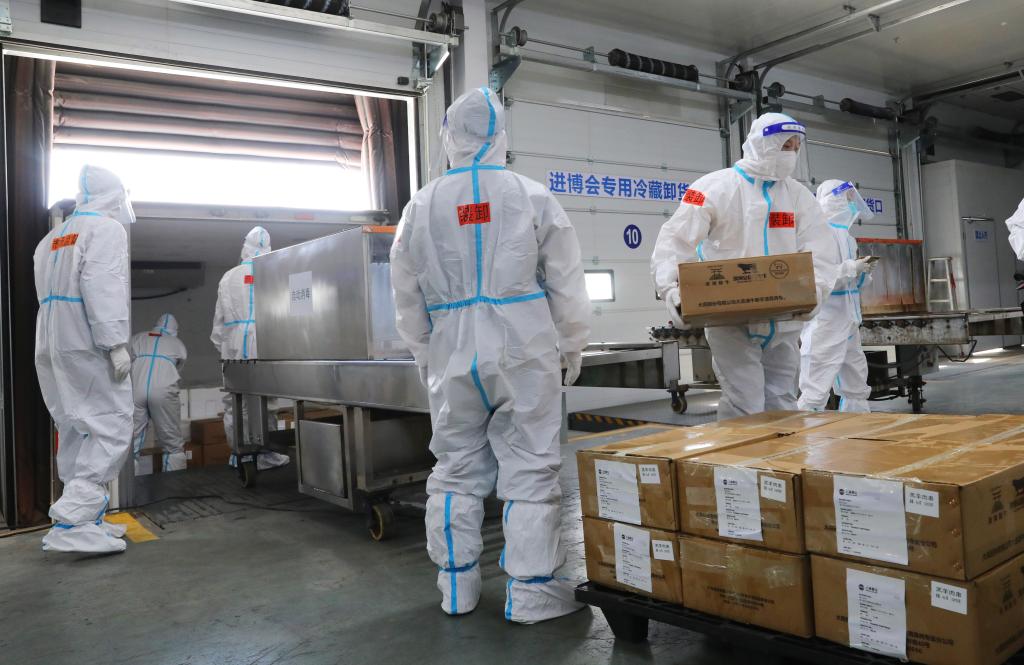 10月20日,工作人员在总仓内搬运完成卸车消毒的冷链食品展品。(新华社记者 方喆 摄)