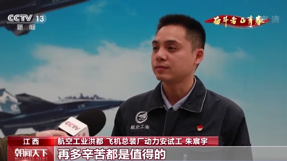 航空工业洪都 飞机总装厂动力安试工 朱宸宇:能够参加这样一项无上光荣的任务,我和我的同事们倍感自豪,其中有艰辛、有波折,任务时间紧凑,我们一直在与时间赛跑、分秒必争。当看到我们的装备顺利展现在祖国和人民面前的时候,再多的辛苦都是值得的。