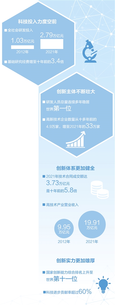 全社会研发经费支出居世界第二位;研发人员总量居世界首位;基础研究和原始创新不断加强,一些关键核心技术实现突破;战略性新兴产业发展壮大……党的十八大以来,我国在载人航天、探月探火、深海深地探测、超级计算机、卫星导航、量子信息、核电技术、大飞机制造、生物医药等领域取得重大成果,进入创新型国家行列。