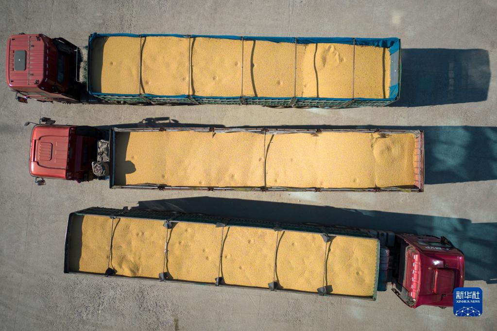 这是10月25日拍摄的装满大豆的运粮车在绥化市益盛粮食购销有限公司院内等待入库(无人机照片)。新华社记者 张涛 摄